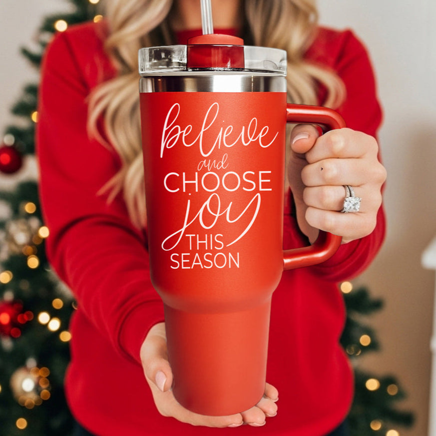 Stay warm and stay positive this winter with the Believe + Joy 40oz mug! This oversized red tumbler has everything you need to enjoy your favorite hot beverage all season long - a lid, straw, and handle. The inspirational quote will inspire you to Believe and choose Joy this Christmas!