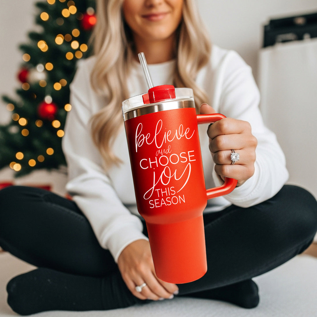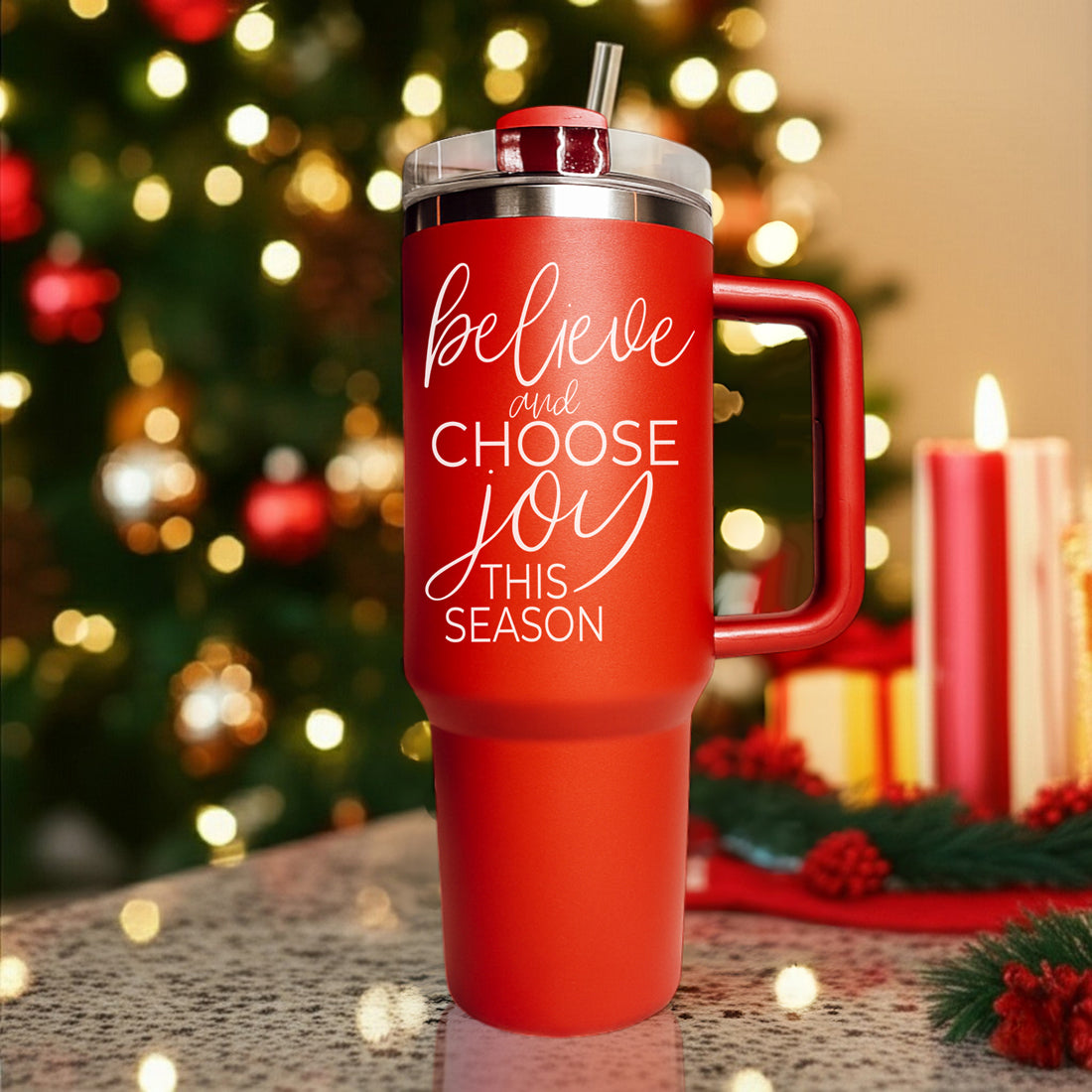 Believe and Choose Joy This Season Insulated Mug with handle, lid and straw