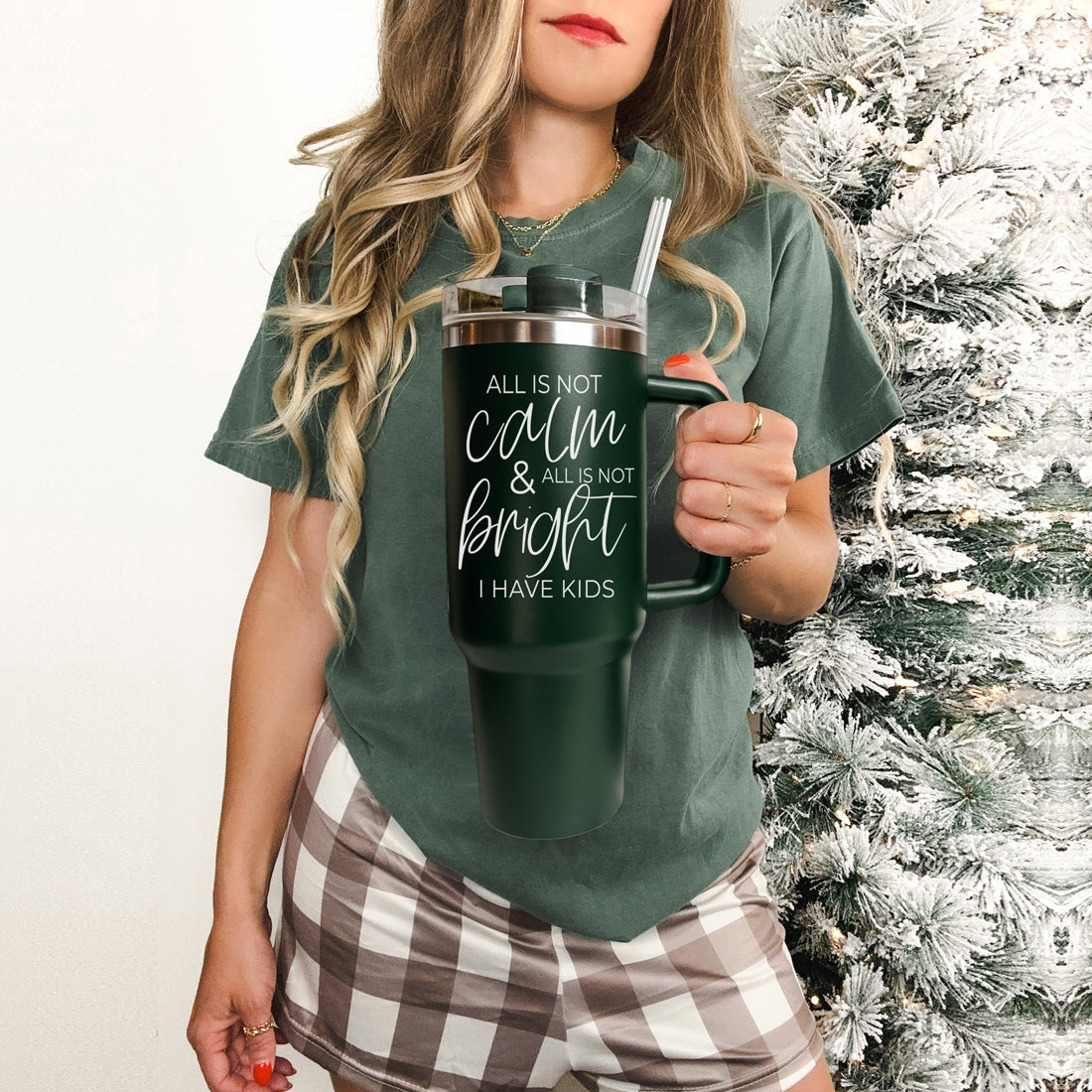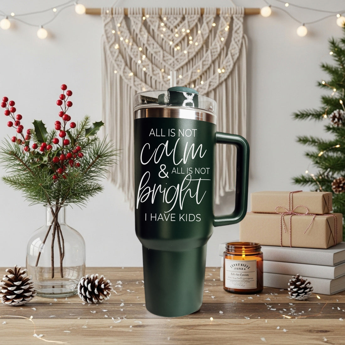 Embrace the chaos of parenthood with a touch of holiday humor! Our 40oz tumbler, available in festive red or green, is here to keep you caffeinated through the madness. With "All is Not Calm & All is Not Bright, I Have Kids" proudly displayed, this tumbler says what every parent is thinking during the holiday season.