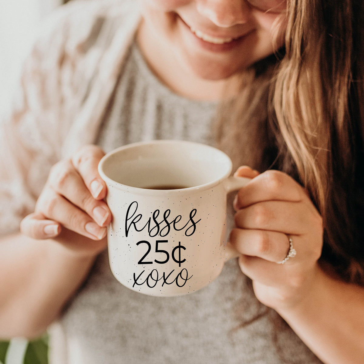 Step right up! This mug is dishing out smooches at a bargain price of just 25 cents. With "Kisses 25 Cents" boldly printed on one side and a sweet little "xoxo" underneath, it’s the cutest way to sip your morning brew while offering some affordable affection—no strings attached!