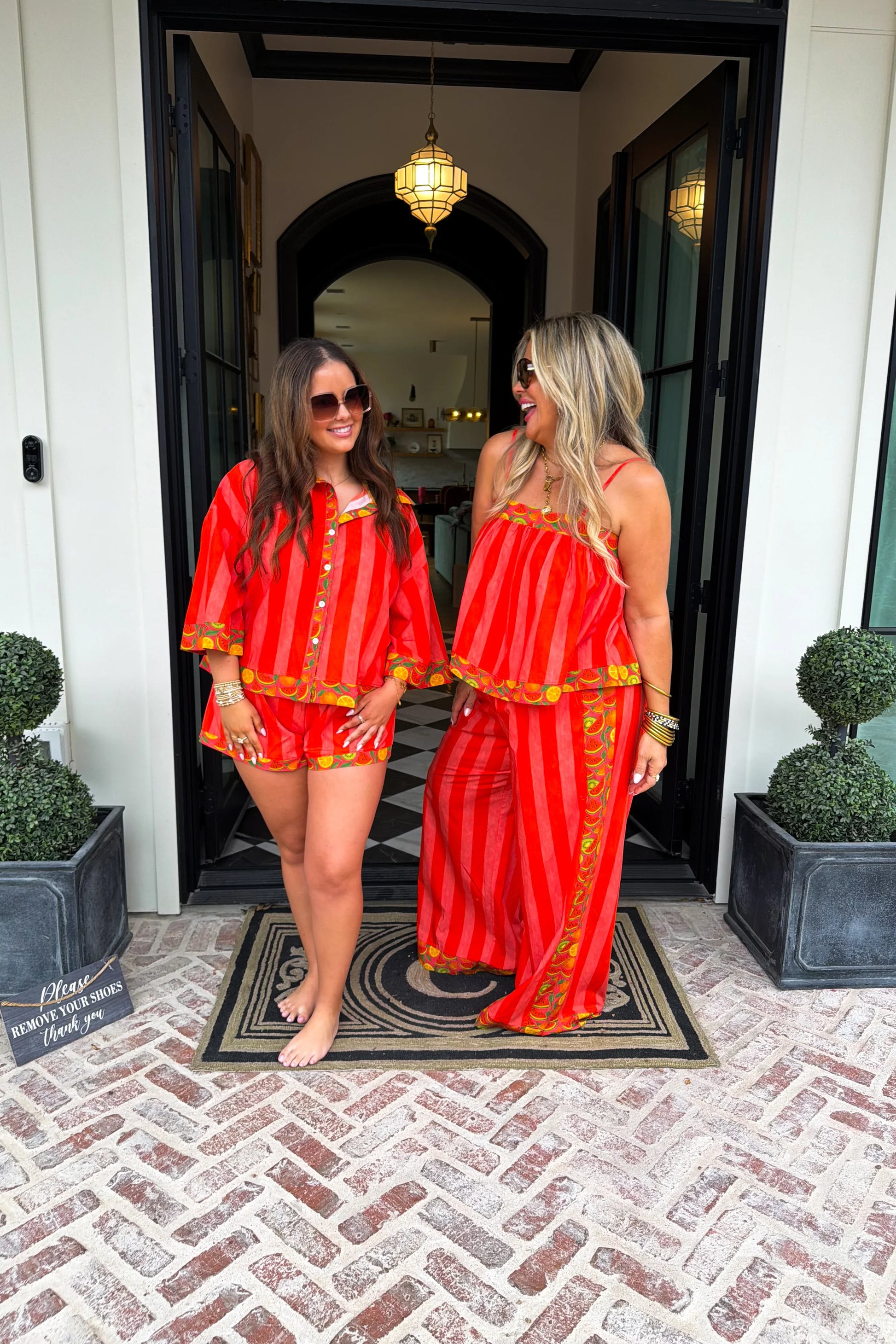 Bring bold, breezy vibes to your wardrobe with these colorful striped wide-leg pants! Designed with a relaxed fit and playful citrus-inspired trim, these lightweight pants are perfect for resort days, lounging, or casual outings.