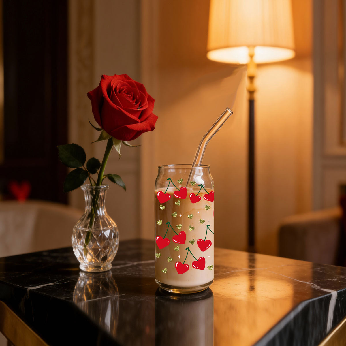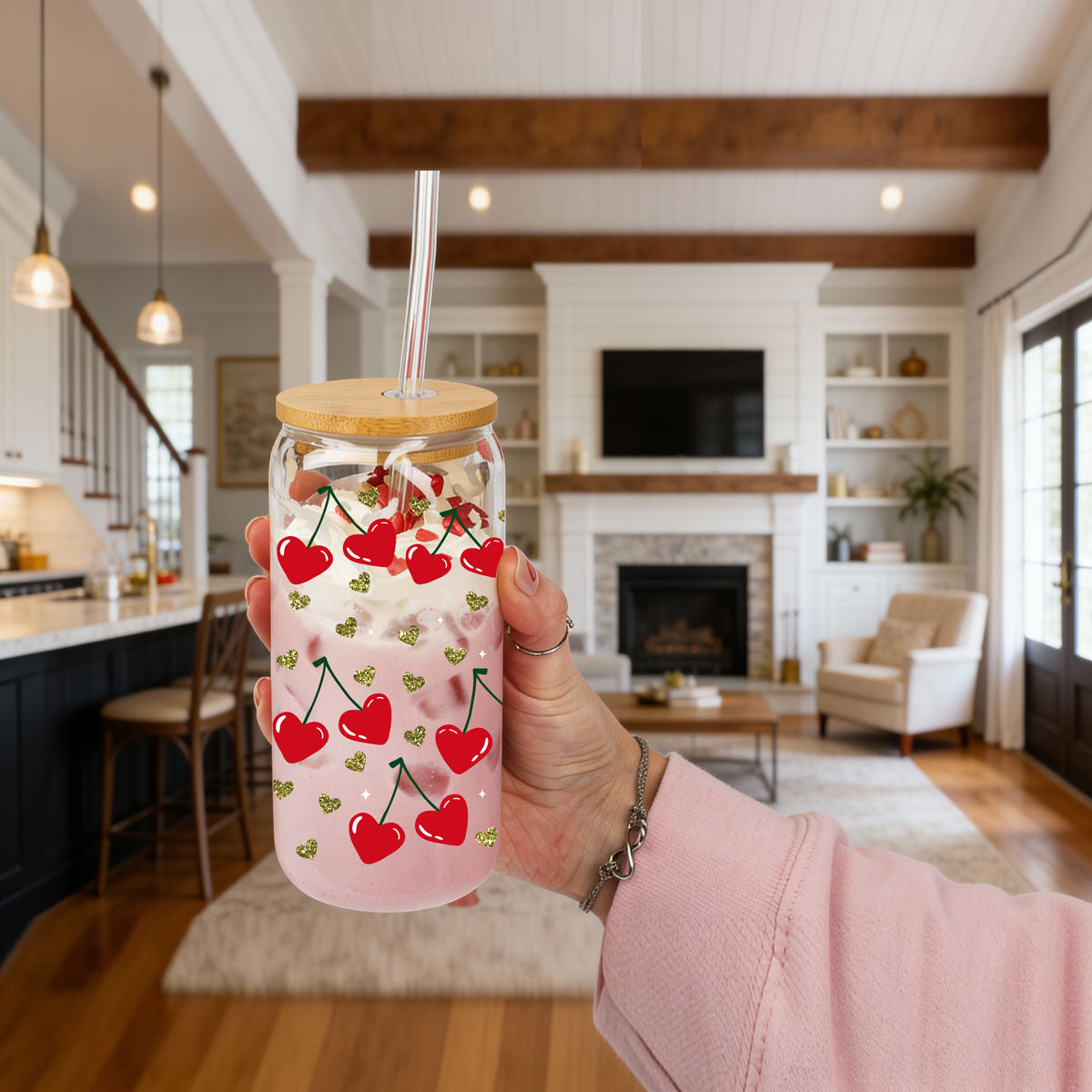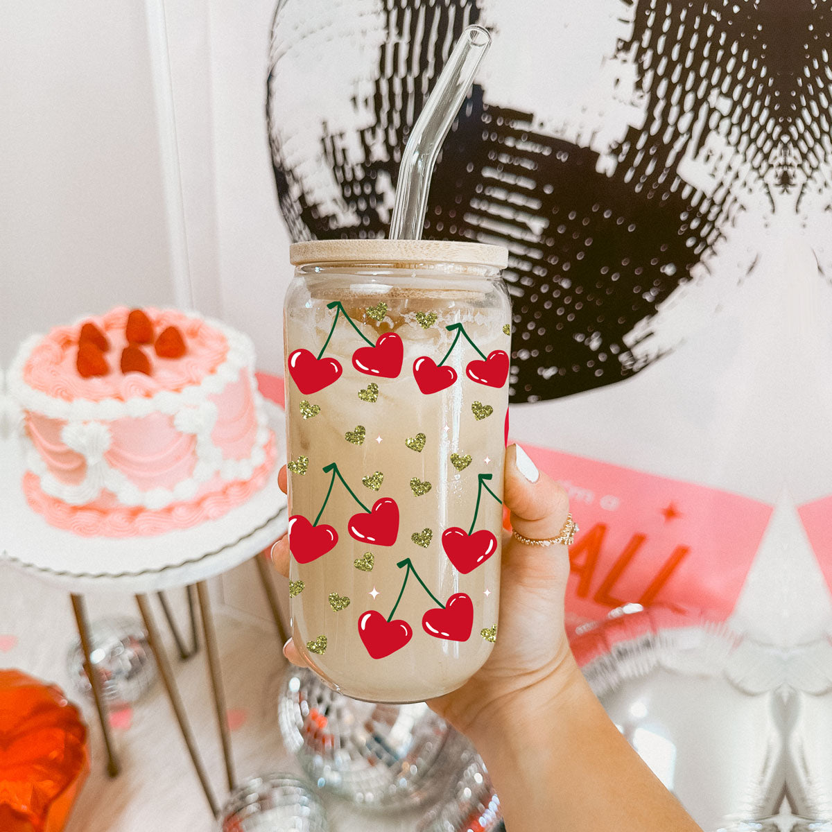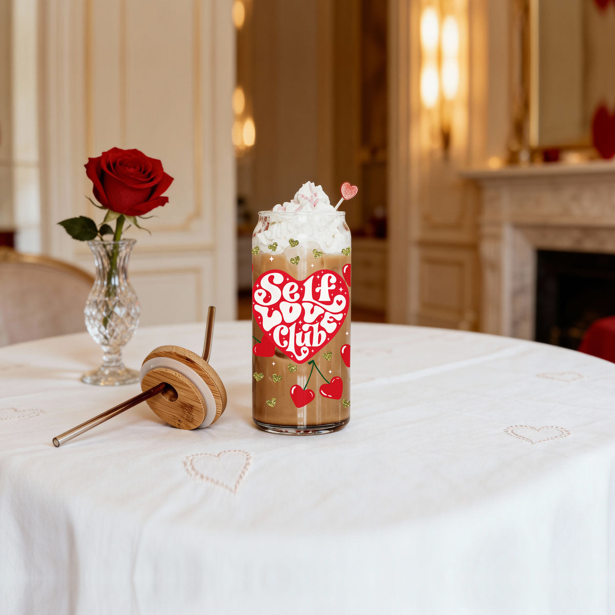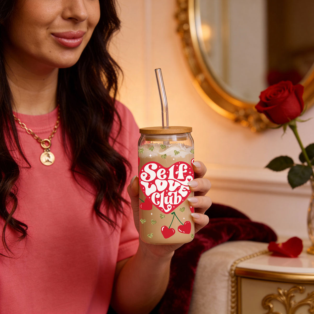Welcome to the Self Love Club, where every sip is a celebration of you! This 20oz glass cup features a big, bold red heart right in the center, surrounded by a sprinkle of cherry-shaped hearts and gold accents for a touch of glam. Complete with a bamboo lid and glass straw, this cup makes hydration look good and self-care feel even better.
