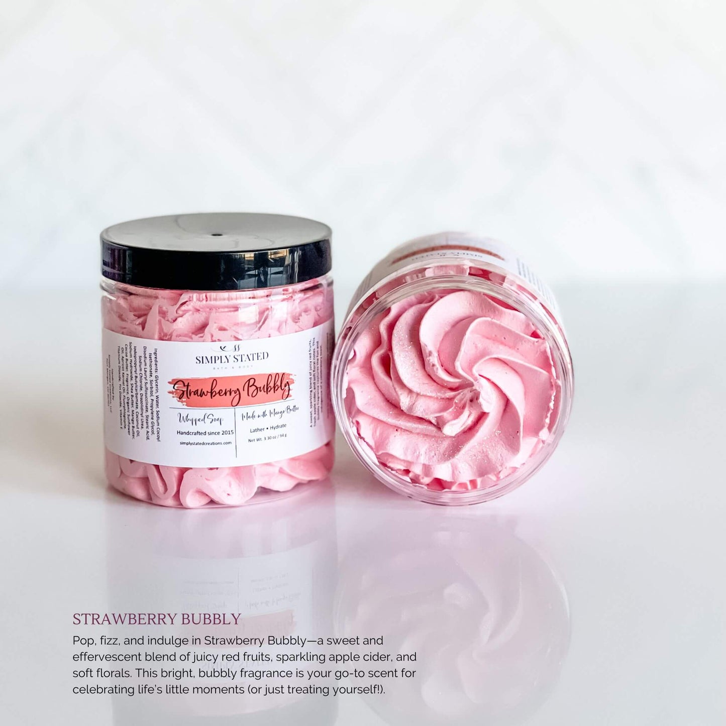 Upgrade your shower routine with Sweet Temptations Whipped Soap. Creamy, luxurious, and available in three enchanting scents—Wild Berry Kiss, Raspberry Vanilla Crush, and Strawberry Bubbly—this versatile soap cleanses, hydrates, and pampers your skin with a rich, foamy lather.